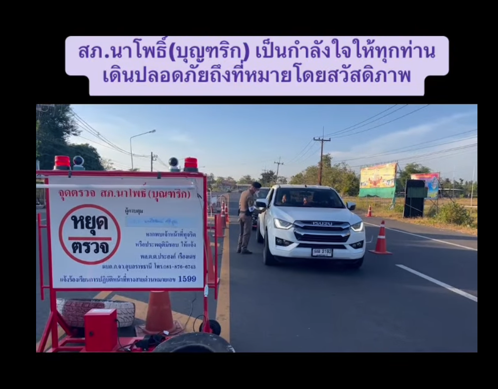 เจ้าหน้าที่ตำรวจ สภ.นาโพธิ์(บุญฑริก)ได้ประชาสัมพันธ์โครงการจิตอาสาจราจรรณรงค์การขับขี่ปลอดภัย สวมหมวกนิรภัย,เมาไม่ขับ เพื่อลดอุบัติเหตุจราจรทางบก ในช่วงเทศกาลปีใหม่ 2568 ณ จุดบริการประชาชน ตู้ยามบ้านกลาง ตำบลนาโพธิ์ อำเภอบุณฑริก จังหวัดอุบลราชธานี